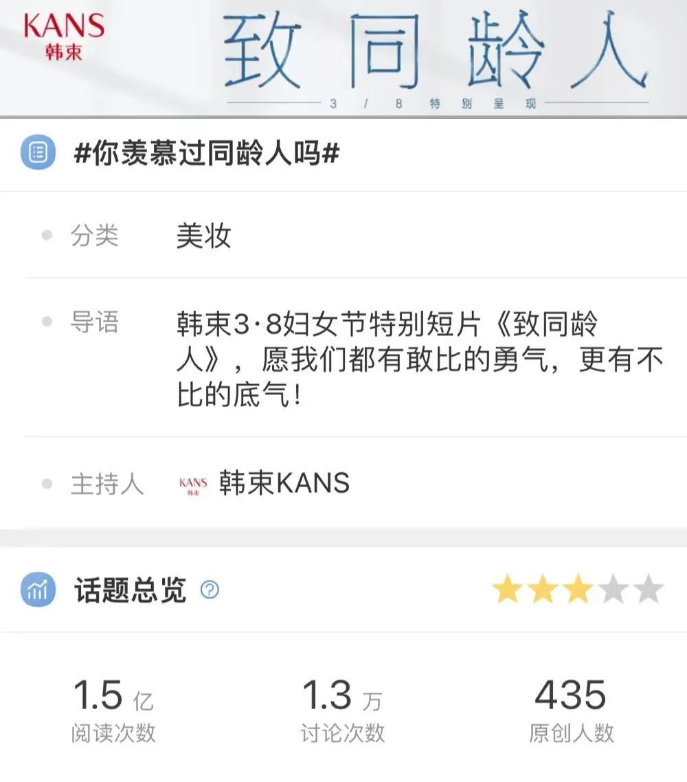 2022年,韓束將品牌定位升級(jí)為“科學(xué)抗衰”,提出全新口號(hào)“為年輕提供一份底氣”,從與中國(guó)國(guó)家游泳隊(duì)共創(chuàng)#每一刻冠軍#全民話題,到今年情人節(jié)提出主張“單身也要愛自己,祝我情人節(jié)快樂”,再到如今女神節(jié)campaign的打造。韓束通過一次次集溫度和創(chuàng)意于一體的話題塑造,將目光更多投向年輕人關(guān)注的話題,用更年輕的語(yǔ)言和他們展開溝通,更有效地傳遞了品牌定位,彰顯了國(guó)貨頭部品牌的價(jià)值觀和使命感。