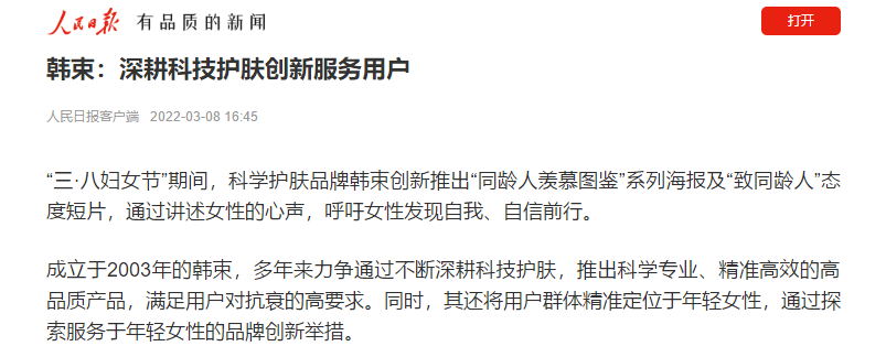 3.8女神節(jié),上美集團(tuán)旗下韓束品牌進(jìn)行#你羨慕過同齡人嗎#一系列態(tài)度發(fā)聲,在這個(gè)特別的日子,鼓勵(lì)全天下女性:“要擁有敢比的勇氣,更要有不比的底氣”,中國(guó)國(guó)家游泳隊(duì)共同呼吁,人民日?qǐng)?bào)客戶端也報(bào)道了該話題。