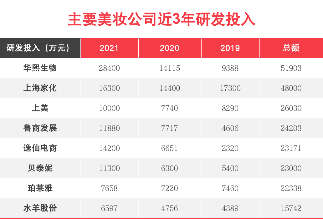 從對本土主要化妝品企業(yè)最近3年研發(fā)投入的統(tǒng)計可以看出,整體呈逐年增加的趨勢,如果按照近3年的投資總額排名,除了從原料研發(fā)到品牌打造已經形成一體化的華熙生物以及百年企業(yè)上海家化,上美近3年的研發(fā)投入總額,已經排在了同類型公司的最前列。
