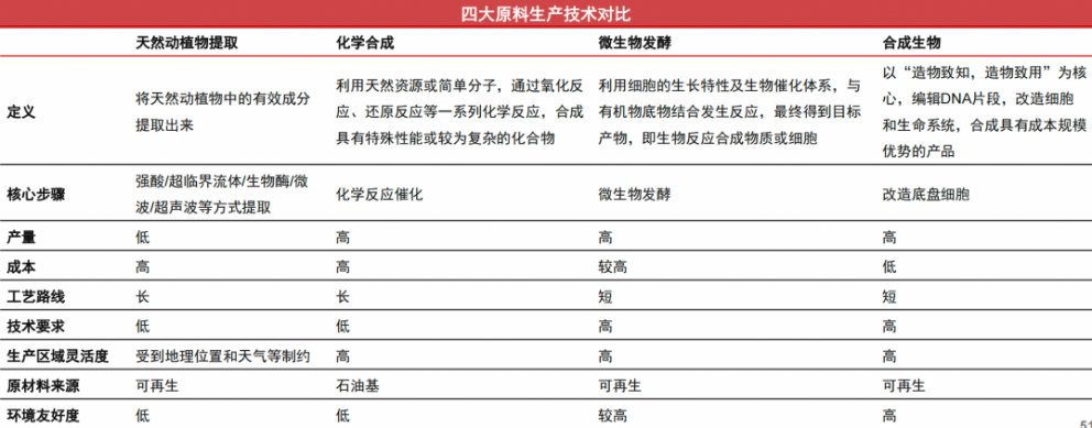 據了解,目前的化妝品原料核心來自“化學合成”“天然動植物提取”“微生物發(fā)酵”和“合成生物”四大技術。其中“化學合成”技術是在化妝品領域應用歷史最長,也是最為成熟的技術。而“天然植物萃取”和“微生物發(fā)酵”是目前最熱門的技術。“合成生物”則被認為是能夠引領未來的新技術。[7]