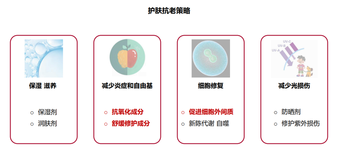 我們觀察到市場上大部分抗老產(chǎn)品主要解決的是皮膚外在衰老癥狀的問題,即淡紋、緊致、祛黃等,我們在立項做一款抗衰老產(chǎn)品的時候,希望真正用護膚品解決皮膚衰老問題,因此,我們深入研究了導致皮膚產(chǎn)生皺紋等衰老現(xiàn)象的內(nèi)在因素(“病因”)。
