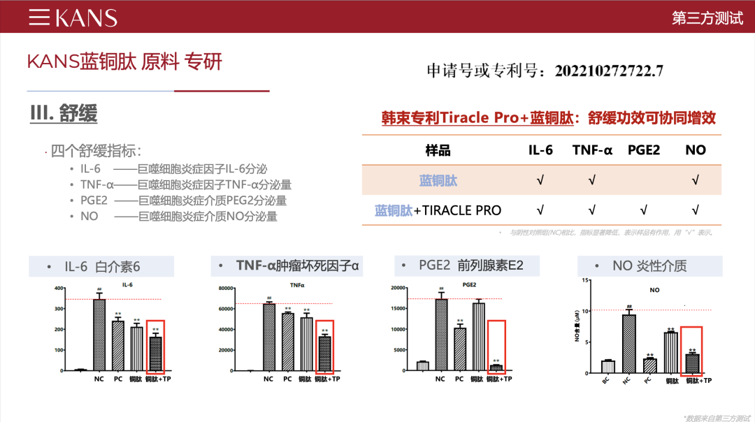 根據(jù)實驗數(shù)據(jù)顯示,2種炎癥因子、2種炎性介質(zhì)都顯著降低,復配組合的結(jié)果遠遠優(yōu)于測試方陽性對照。對于這個好的結(jié)果,我們也對銅肽+Tiracle pro組合申請了“協(xié)銅舒緩”國家發(fā)明專利。