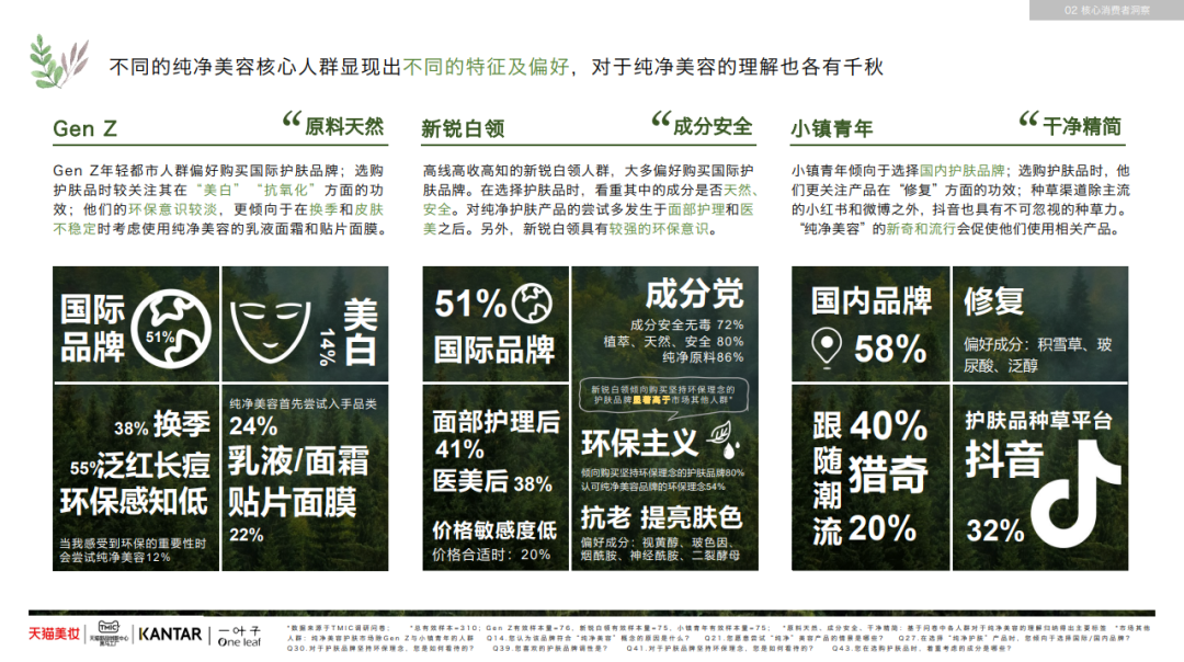 在人群特征上,純凈美容的主要客群以18-29歲的女性為主,占調(diào)查樣本的64%。小鎮(zhèn)青年、新銳白領(lǐng)和Z世代人群是核心客群,他們貢獻了純凈美容市場近6成的消費。