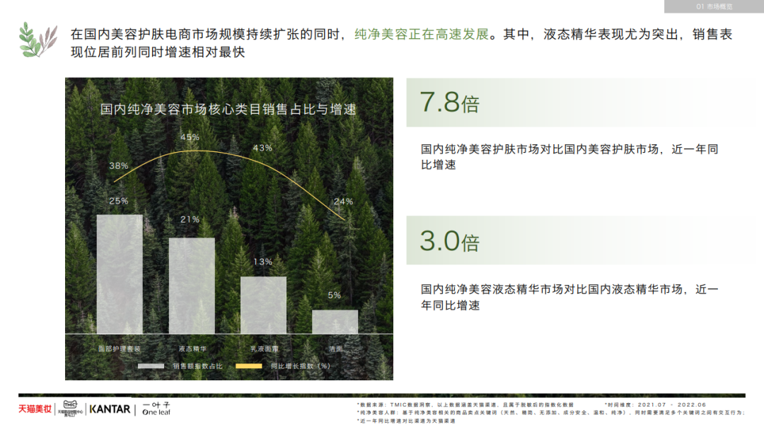 尤其在以天貓為主的主流電商平臺,純凈美容有著強勁的發(fā)展勢頭。白皮書顯示,近一年(2021年7月-2022年6月),純凈美容護膚市場的增速是美容護膚行業(yè)的7.8倍。