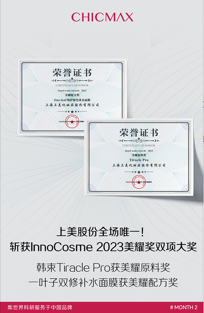 近日,在InnoCosme Awards 2023美耀獎頒獎典禮上,上美股份同時斬獲原料、配方兩項大獎,也是全場唯一拿到這兩類獎項的化妝品公司。其中,韓束自主研究成果Tiracle Pro獲得「美耀原料獎」,一葉子修護修色補水面膜獲得「美耀配方獎」。