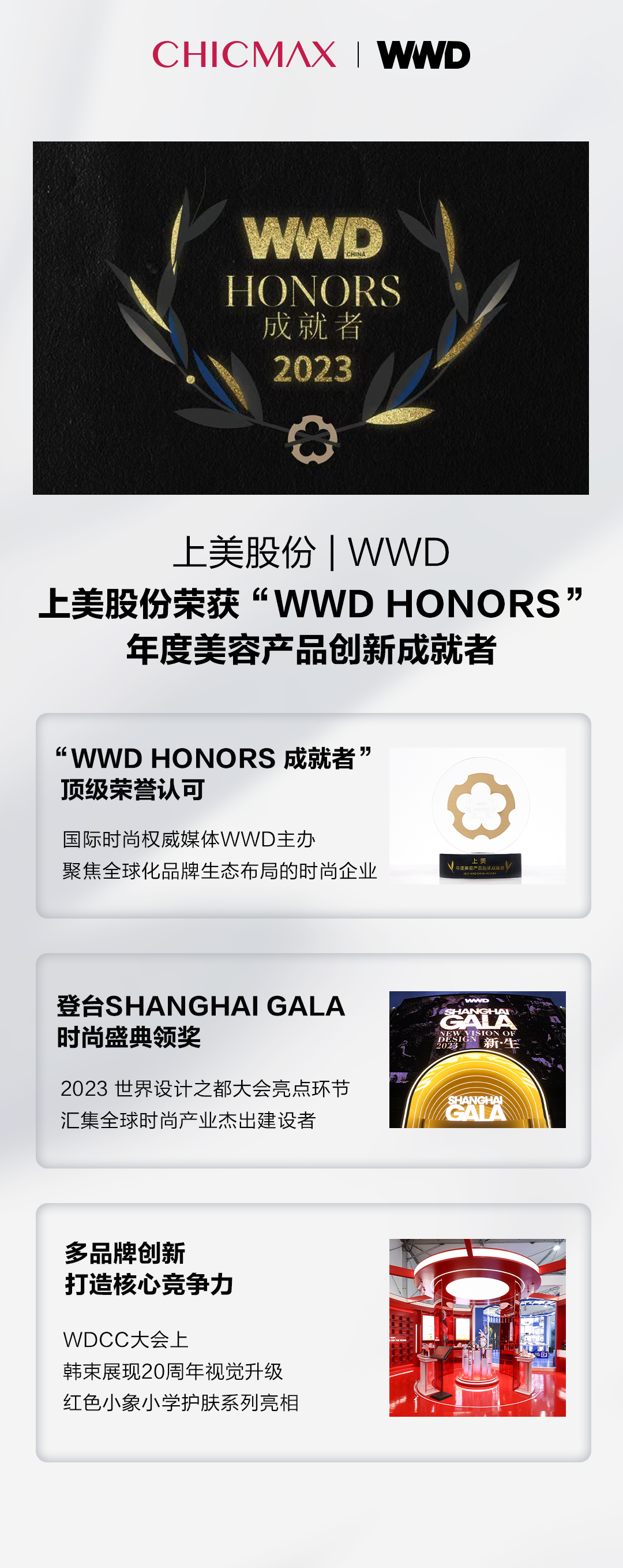 2023年9月28日,首屆SHANGHAI GALA時(shí)尚盛典于上海華麗落幕,備受關(guān)注的“WWD HONORS”獎(jiǎng)項(xiàng)在盛典上正式揭幕,上美股份榮獲“WWD HONORS”年度美容產(chǎn)品創(chuàng)新成就者。