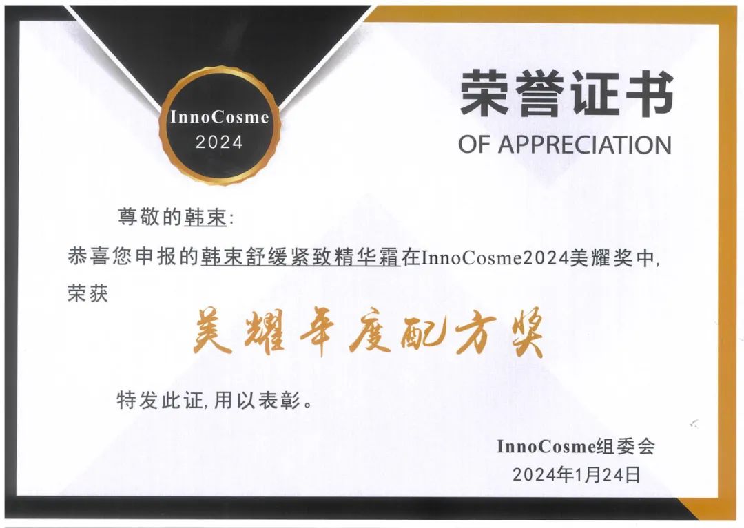經(jīng)過嚴(yán)格的評審打分和大眾投票,韓束藍(lán)蠻腰面霜在一眾產(chǎn)品中脫穎而出,摘得2024 InnoCosme Awards美耀年度配方獎(jiǎng)。這代表著市場及行業(yè)對于韓束前沿創(chuàng)新配方,以及上美科研實(shí)力的高度認(rèn)可。
