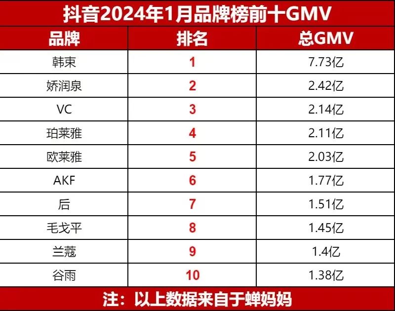 蟬媽媽數(shù)據(jù)顯示,1月,韓束總GMV高達(dá)7.73億元,位列抖音美妝排名榜首,取得斷層式領(lǐng)先;該成績(jī)不僅是歐萊雅的近4倍,更創(chuàng)下韓束單月抖音GMV新高、抖音美妝行業(yè)單月GMV新紀(jì)錄。