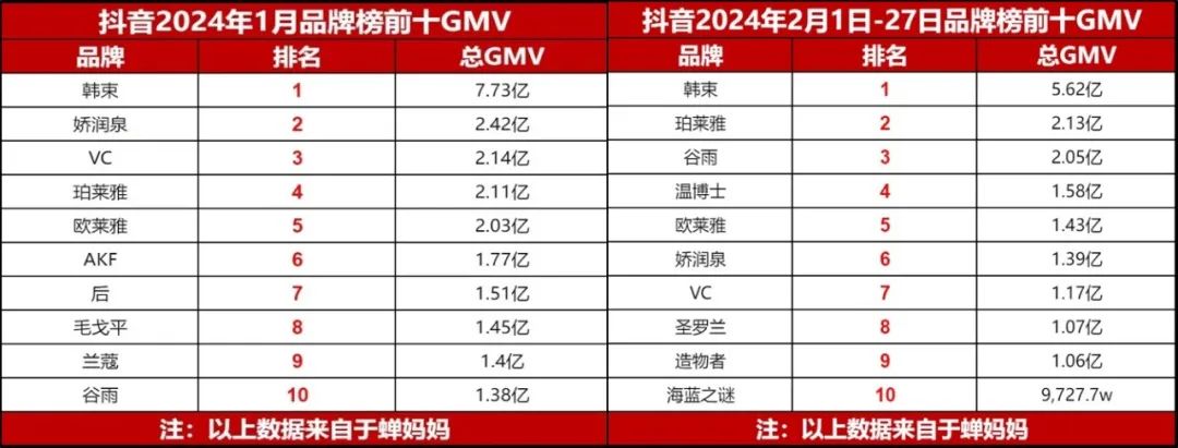 2024年1月,韓束以7.73億元GMV、同比增長756%的優(yōu)異表現(xiàn),再度登頂抖音。截至2024年2月27日,韓束仍以5.62億元GMV穩(wěn)坐2月榜單第一。