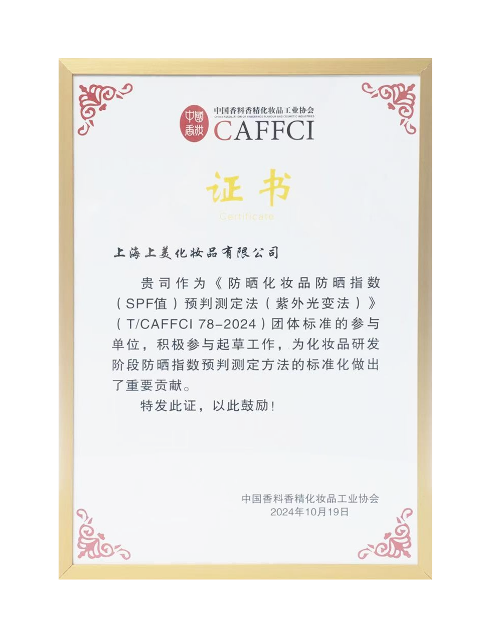 作為領(lǐng)軍企業(yè),上美股份也不斷推動中國化妝品行業(yè)的進步,參與多項行業(yè)規(guī)范和標準的制定。例如,今年,上美作為《防曬化妝品防曬指數(shù)(SPF值)預判測定法(紫外光變法)》(T/CAFFCI78-2024)團體標準的參與單位,積極參與起草工作,因此也在本次大會上受到了香化協(xié)會表彰,感謝上美為化妝品研發(fā)發(fā)展做出的重要貢獻。